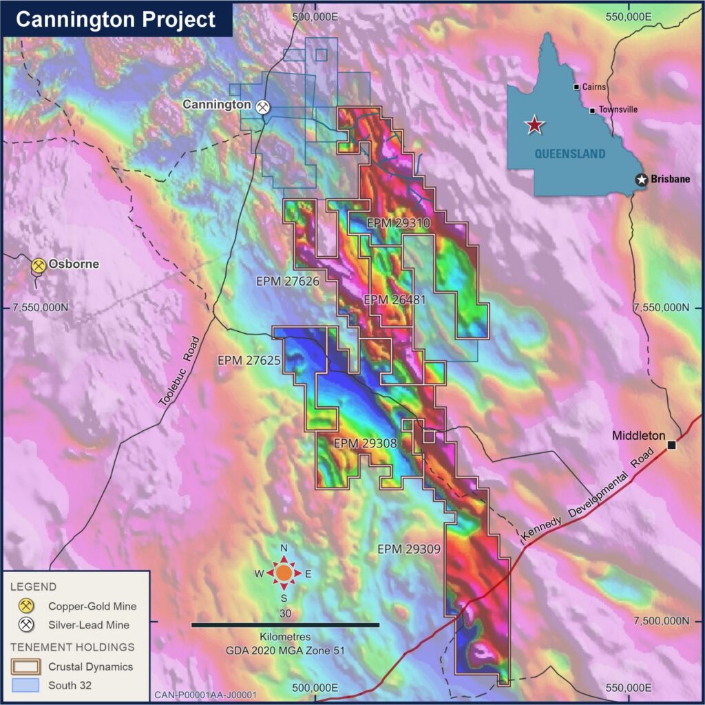 - The Cannington Project comprises six Exploration Permit for Minerals (EPM) holdings in the Mount Isa region of Queensland. Three granted EPMs have been acquired from Mawson Queensland and are pending final agreement with Southern Cross Gold. An additional three new EPM applications have been lodged and are 100% owned by Crustal Dynamics. The consolidated land position secures strategic tenure along the Cannington structural corridor, targeting high-value Cu–Au and Pb–Zn–Ag mineral systems.
